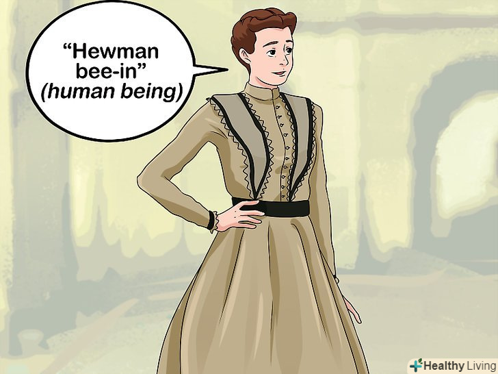 Виробіть легкий акцент.як безсмертна людина, ваш персонаж цілком може бути представником іншої країни або епохи. Спробуйте включити в свою промову легкий акцент того часу або місця, звідки ваш персонаж родом.- Будучи російськомовним росіянином, спробуйте говорити з легкимбританським Або французьким акцентом.
