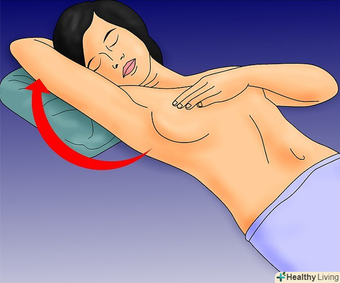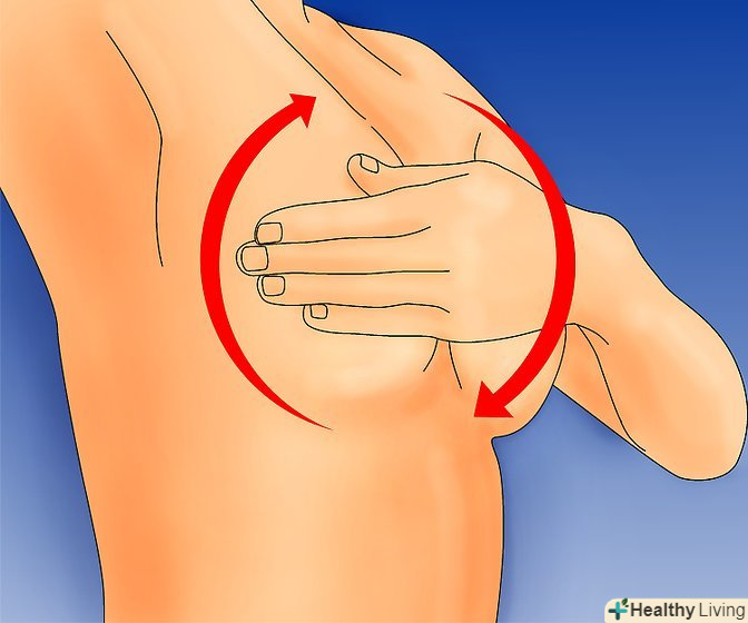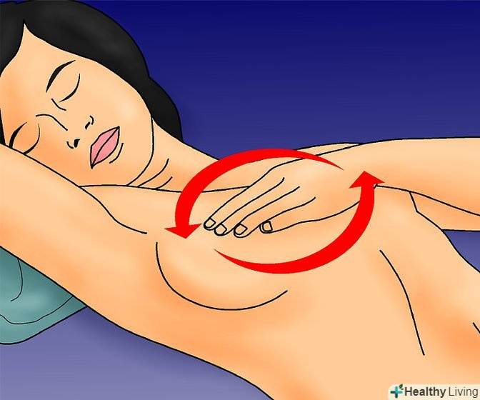 Лівою рукою круговими рухами ніжно обмацайте всю область грудей.[6] не забудьте і про сторони грудей, також обстежте і пахвові западини на предмет виявлення ущільнень, потовщень або вузликів.- При обстеженні використовуйте надавлюють руху різного ступеня.
