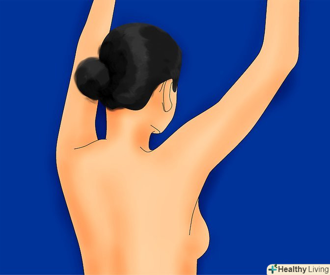 Підніміть праву руку над головою і лівою рукою обстежте праву груди.Подушечками пальців проведіть невеликий огляд круговими рухами всієї області грудей. Ви робите огляд на виявлення будь шишки, потовщення або твердих вузликів.[5]- Тканина молочної залози розташована від соска і до пахви. Обов'язково перевірте всю область грудей, включаючи пахви і обидві сторони грудей.