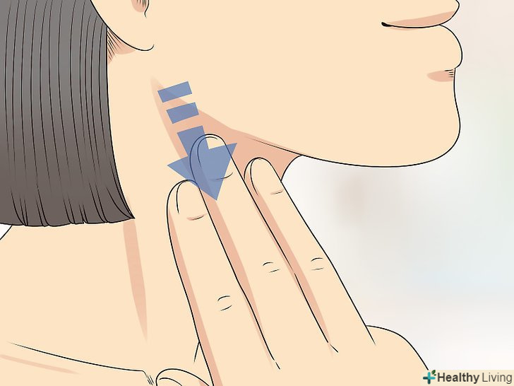 Перевірте лімфовузли на шиї і ключиці.розмістіть пальці за вухами, опустіть їх вниз, до шиї, а потім пропальпіруйте під щелепної кісткою. Якщо ви відчуєте будь-які хворобливі грудочки, значить, ваші лімфовузли запалені.[2]- Якщо вам не вдається намацати лімфовузли на шиї, не переживайте, це цілком нормально.