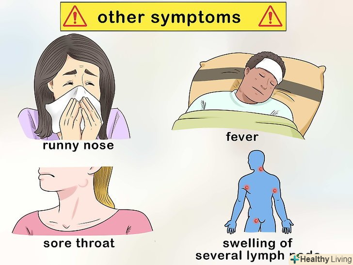 Повідомте лікаря про інші симптоми.хоча не всі симптоми вказують на серйозне захворювання, інформація про них допоможе лікарю поставити правильний діагноз. Разом зі збільшеними лімфовузлами часто можна спостерігати такі симптоми:[8]- Нежить;