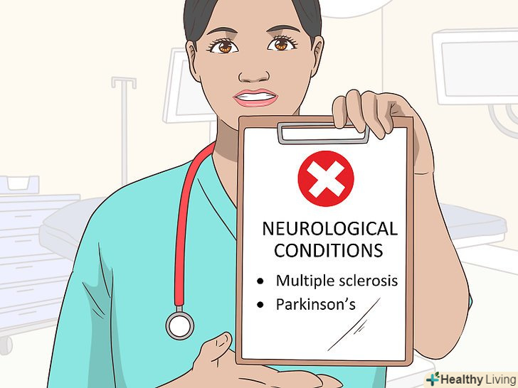Виключіть неврологічні захворювання.м'язові спазми можуть виникнути через серйозні неврологічних захворювань, таких як розсіяний склероз або хвороба Паркінсона. Якщо ви без видимих причин часто відчуваєте м'язові спазми, зверніться до лікаря.[13]- Лікар розпитає вас про інші симптоми і при необхідності направить до невропатолога для подальшого обстеження.