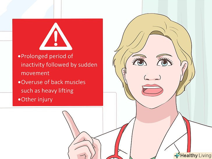Визначте причину спазму.спазм м'язів спини може бути викликаний різким рухом після того, як ви тривалий час перебували в стані спокою. Спазм може трапитися також внаслідок надмірного напруження м'язів спини, наприклад після підняття важких предметів або травми.[7]- Для лікування спазмів спини застосовують безліч різних методів. З'ясуйте, чим викликаний спазм-це допоможе вам вибрати найбільш дієве лікування.