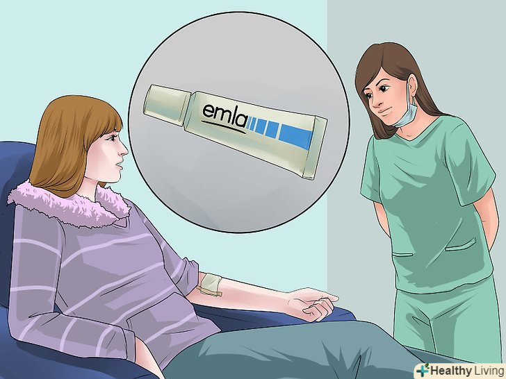 Запитайте лікаря про крем ЕМЛА.якщо у вас вже брали кров і ви знаєте, що ви погано переносите цю процедуру, запитайте лікаря про крем ЕМЛА. Це місцевий анестетик, який наноситься на місце уколу за 45 хвилин-2 години до взяття крові.- Якщо ви знаєте, що погано переносите больові відчуття, попросіть медсестру використовувати цей крем.[14]