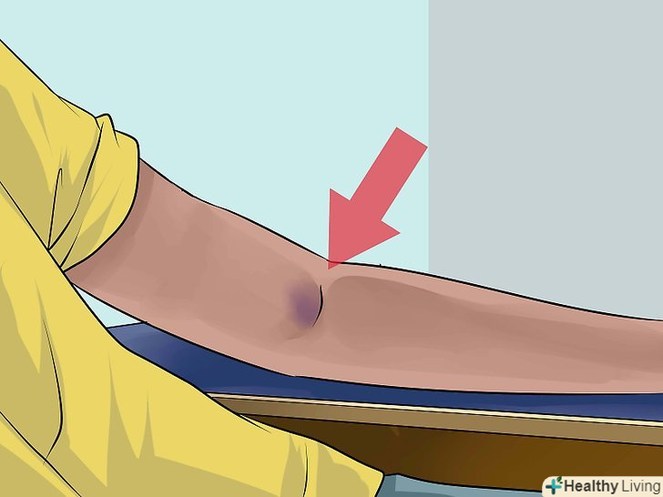 Зверніть увагу на синяк.часто після взяття крові залишається синець (гематома) в місці уколу. Синяк може проявитися відразу або протягом доби після взяття аналізу. Синяк часто утворюється через те, що кров просочується в прилеглі тканини, коли голка виявляється в вені. Крім того, синці можливі через порушення згортання крові або прийому антикоагулянтів.- Туга пов'язка на місці уколу протягом п'яти хвилин (а це довше, ніж потрібно для зупинки кровотечі на поверхні шкіри) знижує ризик утворення синяка, тобто концентрації крові за межами судини.[23][24]