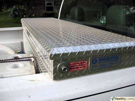 - купуйте та встановіть великий ящик (і) для інструментів. Ящики бувають абсолютно різних конфігурацій, але якщо ви не можете знайти те, що ідеально відповідає вашим потребам, можете звернутися в майстерню, де вам під замовлення зроблять ящик, відповідний вашими вимогами.A standard locking aluminum tool box for storing small items.