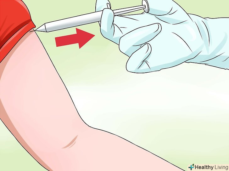 Введіть голку в дельтоподібний м'яз пацієнта.затисніть м'яз пацієнта між двома пальцями і міцно тримайте. Попередньо поцікавтеся, яка рука у пацієнта є переважаючою, і введіть вакцину в іншу руку, щоб запобігти надмірні больові відчуття після вакцинації.[25] якщо ви вперше вводите вакцину проти грипу, це необхідно робити під наглядом більш досвідченого медперсоналу, який простежить за вашою технікою.- Знайдіть найбільш м'ясисту частину дельтоподібного м'яза, яка зазвичай знаходиться вище пахви і нижче акроміона (верхньої частини лопатки).[26] плавним впевненим рухом введіть голку в дельтоподібний м'яз. Робити це слід під кутом в 90 градусів до шкіри.[27]