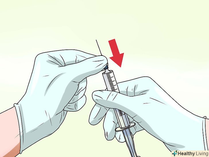 Покладіть голку на новий одноразовий шприц.Підібравши голку відповідного розміру, надіньте її на шприц, в який будете набирати вакцину. Для вакцинації необхідно взяти новий одноразовий шприц, щоб не заразити пацієнта будь-якими бактеріями або захворюваннями.[19]