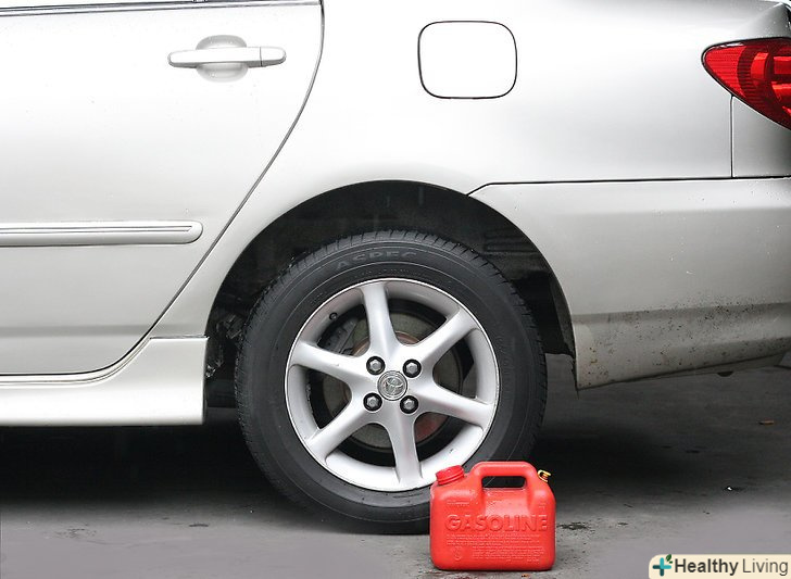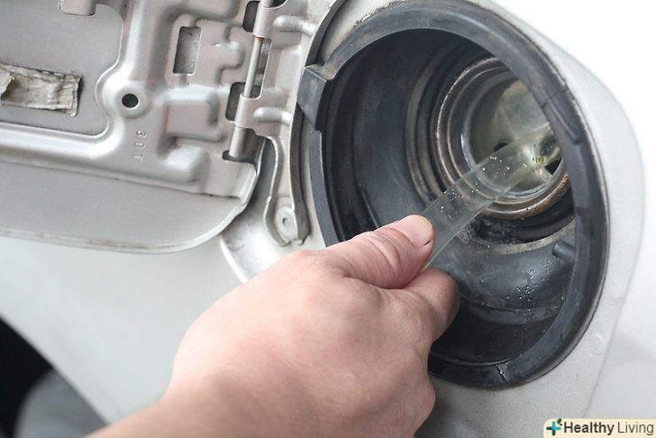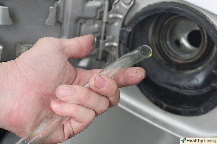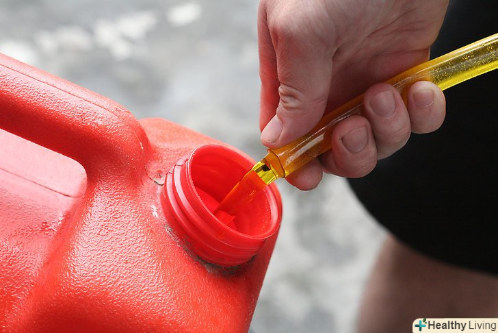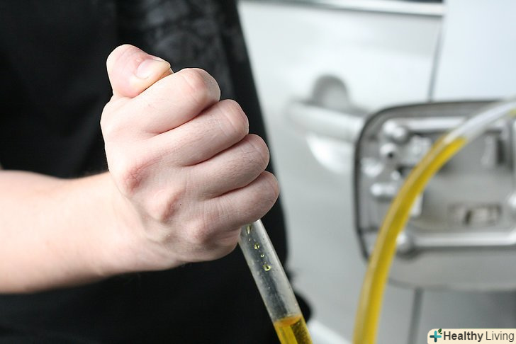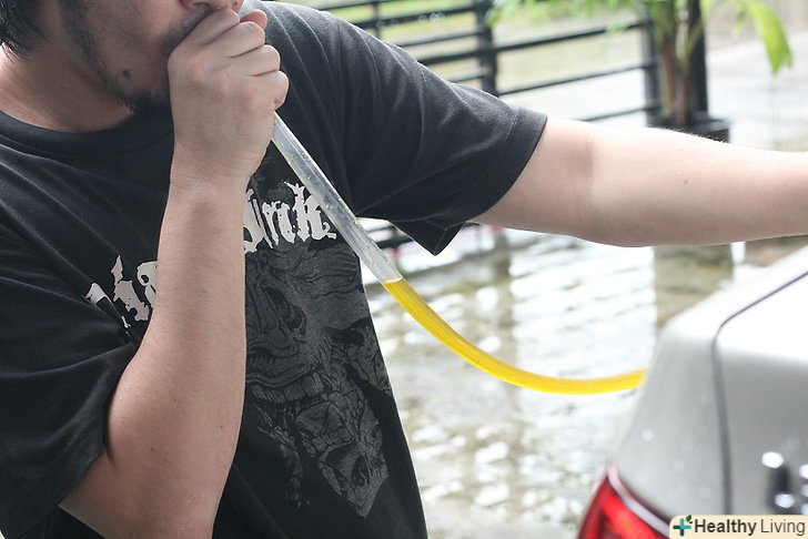Потягніть бензин ротом, щоб він почав текти по трубці, коли бензин майже дійде до рота, витягніть трубку з рота.