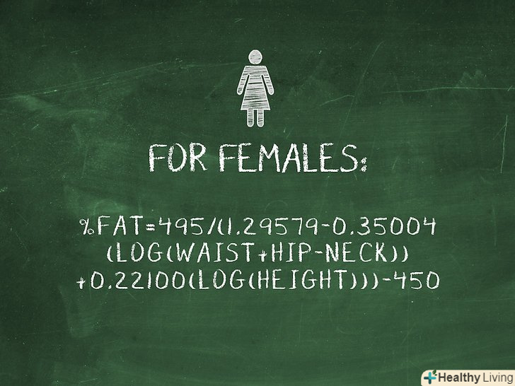 Підставте записані значення у відповідну формулу.Використовуйте наступну формулу, щоб розрахувати відсоток жиру в організмі для жінок:- Для жінок: %жиру = 495/(1,29579 – 0,35004*(log(талія + стегна - шия)) + 0,22100 * (log (зростання))) - 450
