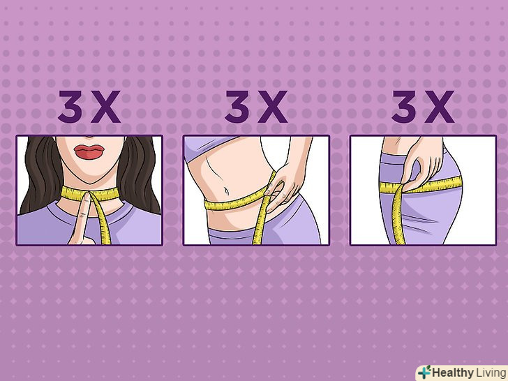 Зробіть точний виміри.Вимірюючи мірною стрічкою відсоток жиру в організмі, Ви повинні знати, як правильно нею користуватися, щоб отримати більш точні дані.[4]- Роблячи виміри, переконайтеся, що мірна стрічка стикається зі шкірою. Вона повинна щільно прилягати до Вашого тіла. Затягніть стрічку тугіше, Але дивіться, щоб вона не вдавлювалася в вашу шкіру.[5]