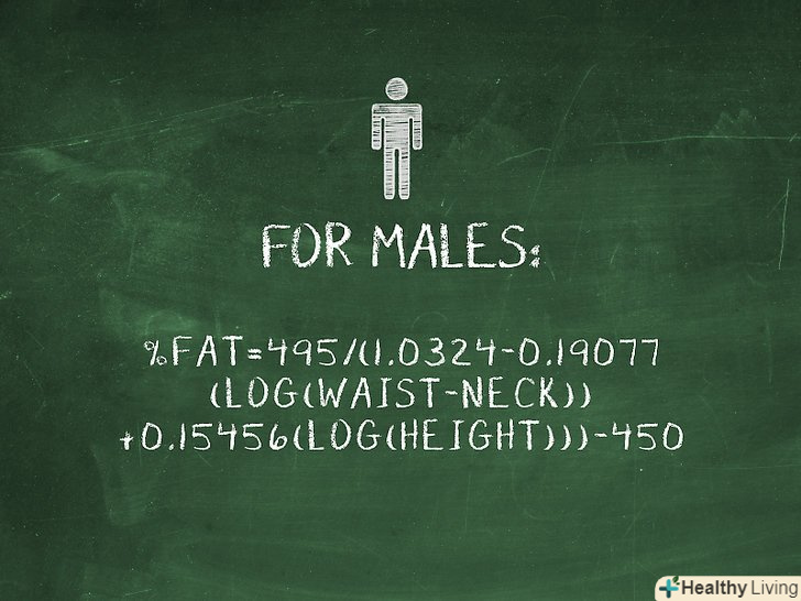 Підставте записані значення у відповідну формулу.Використовуйте наступну формулу, щоб розрахувати відсоток жиру в організмі для чоловіків:- Для чоловіків: %жиру = 495/(1,0324 - 0,19077*(log(талія - шия)) + 0,15456 * (log (зростання))) - 450