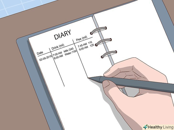 Ведіть "щоденник сечовипускання" близько одного тижня, щоб виявити свої звички.протягом 3-7 днів відстежуйте, коли, що і в якому обсязі Ви п'єте, і коли і в якій кількості ви справляєте малу потребу. Через кілька днів ви, швидше за все, почнете помічати чіткі закономірності в своїх звичках сечовипускання.[12]- В ідеалі слід використовувати чашку для збору сечі, щоб кожен раз відзначати кількість. В якості альтернативи можна просто оцінювати як "багато», «середнє»і "мало".