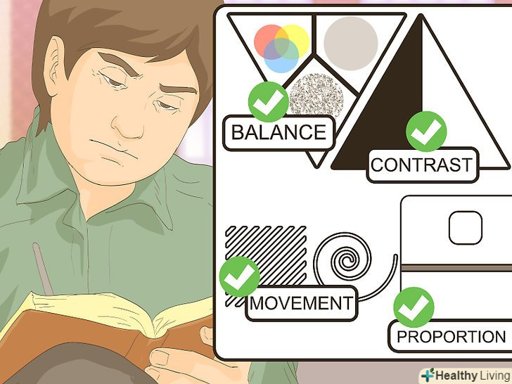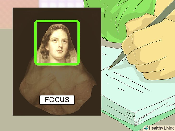 Визначте фокус уваги.у більшості робіт присутня одна або кілька точок, які повинні привертати до себе увагу. У портреті це може бути особа або очі об'єкта. У натюрморті-Центральний або добре освітлений об'єкт. Спробуйте зрозуміти, які саме частини роботи хотів підкреслити автор.[9]- Погляньте на роботу і зверніть увагу, які деталі моментально кидаються в очі або не дають відвести від себе погляд.