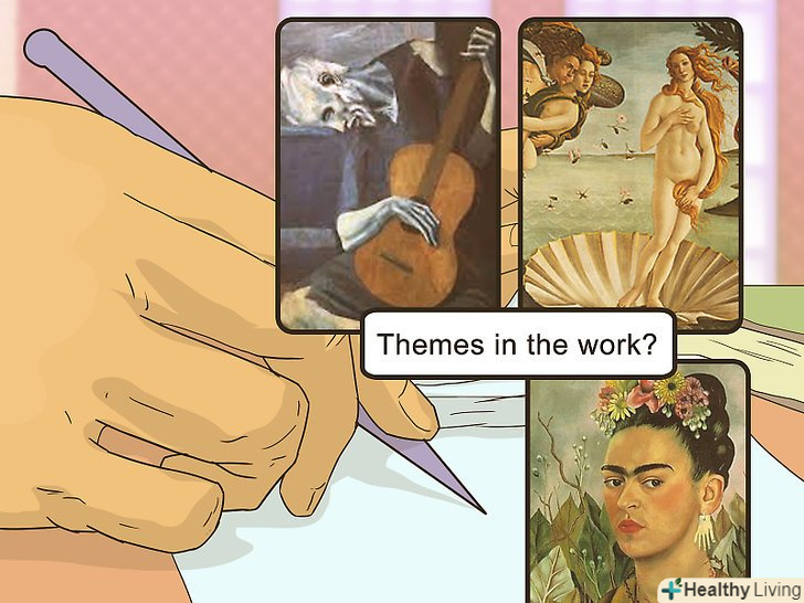 Помічайте теми.визначте кілька ключових тем і розгляньте, як автор використовує елементи образотворчого мистецтва (колір, світло, простір, форми і лінії), щоб робота доносила такі теми. На що звернути увагу:[10]- Використання колірної схеми, щоб надати роботі особливий тон або значення. Для прикладу розгляньте картини Пікассо часів"блакитного періоду".[11]