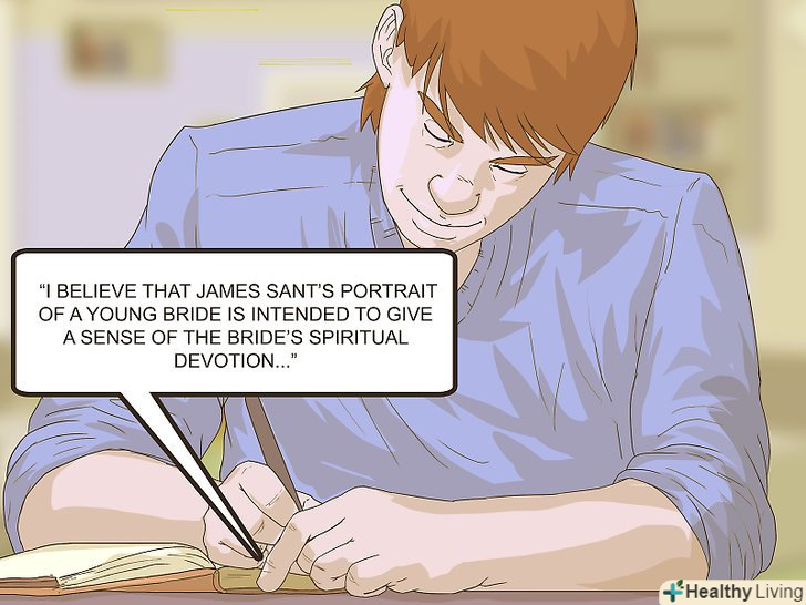 Підкріпіть свою інтерпретацію прикладами.використовуйте приклади з вашого опису та аналізу, щоб пояснити свої думки та почуття.- Наприклад, " на мій погляд, портрет молодої нареченої пензля Джеймса Сента формує образ духовної відданості нареченої. Це знаходить вираз в лінії композиції, яка направляє увагу глядача вгору, слідом за поглядом головного об'єкта. Також в картині використовується тепле світло, джерело якого розташоване трохи вище дівчини".
