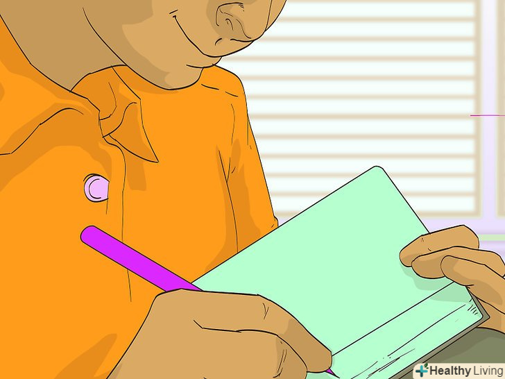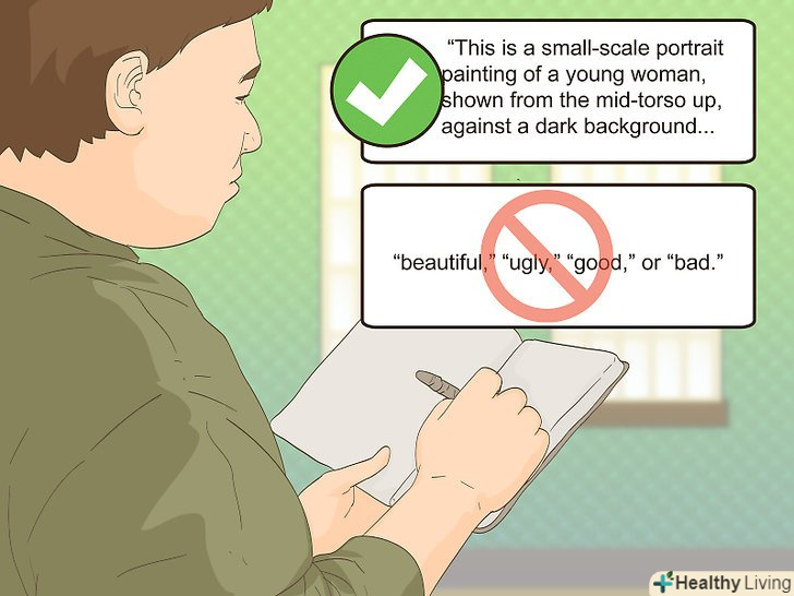 Опишіть побачене. Роботу слід описувати нейтральними термінами. В описі вкажіть форму і масштаб роботи. Опишіть центральні і другорядні об'єкти, якщо на полотні зображені не абстрактні форми.[1]- Наприклад, можна сказати: "це невеликий поясний портрет молодої жінки на темному тлі. Вона зімкнула руки на грудях, а погляд спрямований вгору і вправо від глядача. На жінці рожеве плаття і довга фата, яка спадає нижче плечей".