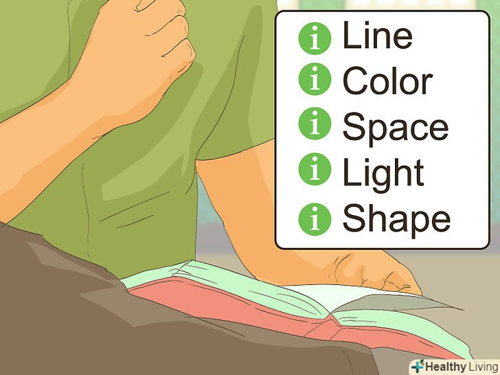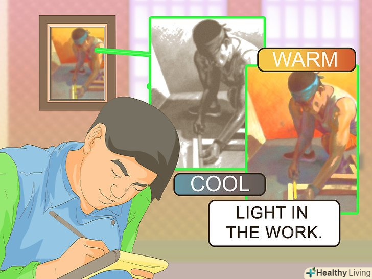 Обговоріть використання кольорів.зверніть увагу на такі параметри, як колірний тон (червоний, зелений, синій), яскравість (світлий або темний) і насиченість. Помічайте загальні колірні схеми і проаналізуйте поєднання кольорів.[4]- Наприклад, кольори протистоять один одному або гармонійно поєднуються? У роботі використано безліч кольорів або один основний колір (наприклад, всі відтінки синього)?