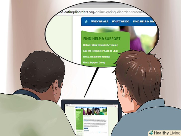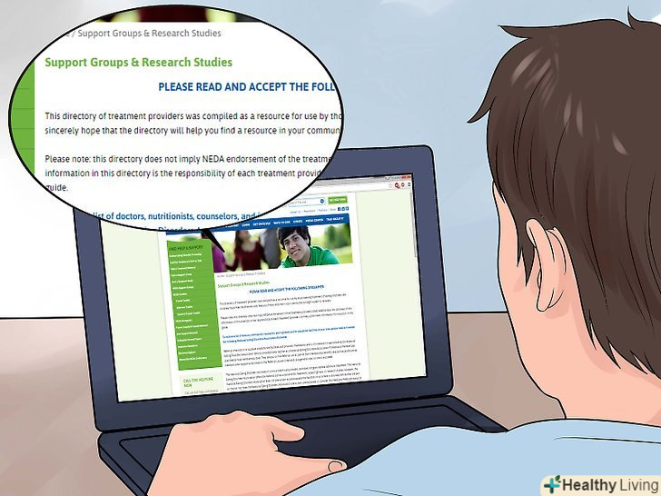 Шукайте підтримку для себе.не так просто бачити, як близька людина бореться з розладом харчової поведінки. Це може бути особливо важко, якщо ваша кохана людина відмовляється визнати, що проблема існує. Шукайте підтримку у Вашого психотерапевта. Завдяки цьому ви залишитеся сильним, незважаючи на непросте випробування.- Ви можете знайти спеціальні сайти, на яких спілкуються родичі тих, хто страждає на анорексію.[44] тут ви можете знайти мережі батьків, сім'ї та друзів. [45]