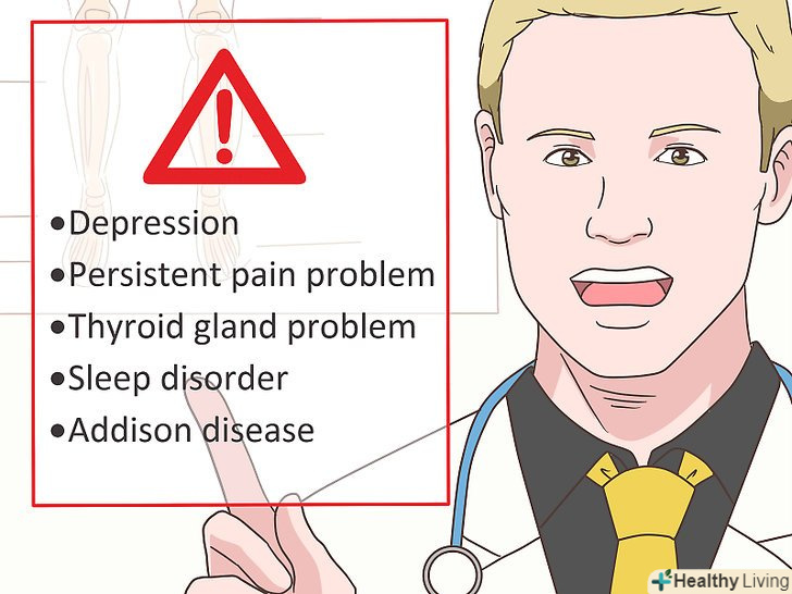 Визначте причину втоми.якщо ви дотримуєтеся здорової дієти, займаєтеся спортом, внесли необхідні зміни в свій спосіб життя, але не бачите результату, можливо, причиною втоми є захворювання або прийом препарату.[55] якщо ви думаєте, що причиною хронічної втоми є захворювання, обов'язково проконсультуйтеся з лікарем, який проведе необхідне обстеження і призначить відповідне лікування. Причиною хронічної втоми може бути:- Анемія, зокрема, залізодефіцитна анемія[56]
