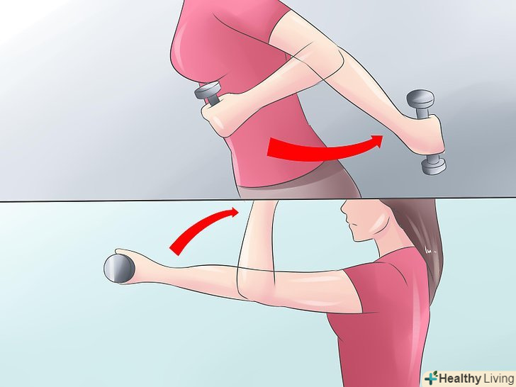 Також розробляйте лікті.ось дві вправи, які ви можете виконувати для зміцнення своїх ліктів, передпліччя і кистей рук:- розведення ліктів.нахиліться трохи вперед і затримайте лікті позаду себе. Підніміть гантель ззаду вас, підтримуючи лікті прямими, а потім зігніть їх. Повторіть так десять разів, а потім поміняйте руки і повторіть це з іншого боку.