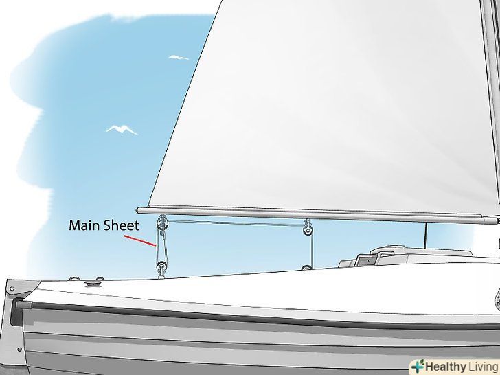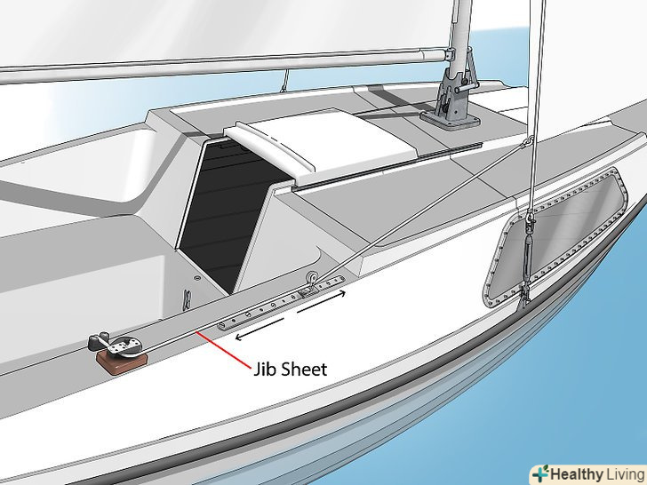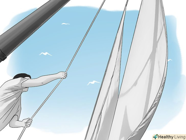 Закріпіть вітрила.закріпіть нижню передню частину (галс) фока і клівера до їх скоб на гику і носі судна.- Ви знайдете маленький леер (грота-шкот), що кріпить задню частину фока (гітів) до гіку і його качці. Затягніть його на вашу силу. Цей натяг буде тримати вітрило.
