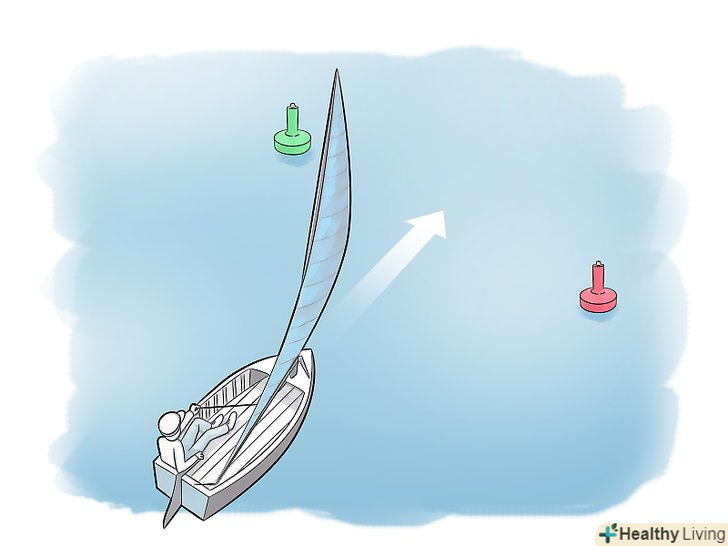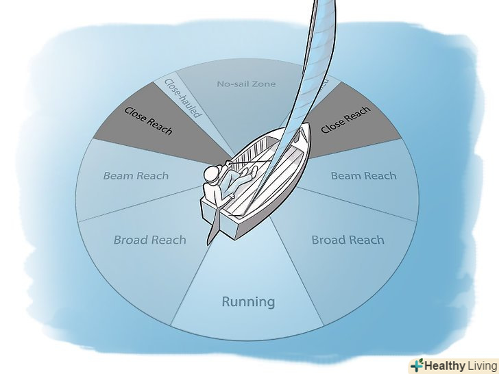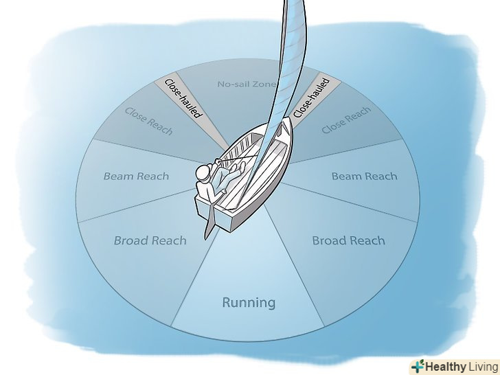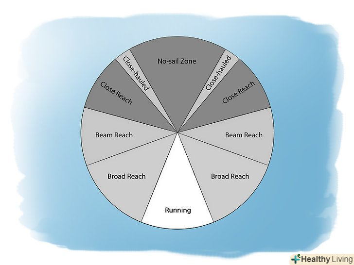 Поправте курс і прямуйте з попутним вітром.Човни не можуть йти прямо за вітром. Як буде показано нижче, червона частина діаграми показує» нерухому " зону під вітрилом. Для того, щоб йти за вітром, човен повинен йти під кутом 45-50 градусів до вітру і міняти напрямок лавіруванням (або зигзагами).- Поверніть човен право керма або ліво керма так, щоб вона була майже перпендикулярно вітру. Це також називається галсом.