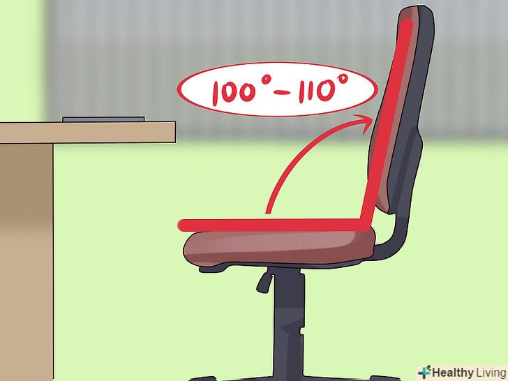 Відрегулюйте спинку крісла, щоб кут був 100°-110°.в ідеалі пасивна спинка відкидного крісла не повинна бути ідеально прямою, а трохи відкинута назад, щоб кут становив трохи більше 90°. Це набагато більш комфортно для вашої спини і надає їй більше підтримки, ніж ідеально пряма спинка.[3]