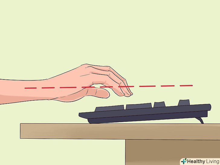 Правильно розташуйте клавіатуру. Налаштуйте висоту клавіатури так, щоб ваші плечі були розслабленими, лікті знаходилися в злегка прочиненому положенні, трохи на відстані від тіла, а зап'ястя і руки лежали прямо.- Використовуйте механізм піддону клавіатури або ніжки клавіатури, щоб відрегулювати нахил, щоб положення клавіатури було для вас зручним. Якщо ви трохи нахилені вперед або перебуваєте у вертикальному положенні, спробуйте відхилити клавіатуру від себе, але якщо ви трохи відхилені назад, то нахил клавіатури до себе допоможе зберегти пряме положення зап'ястя.