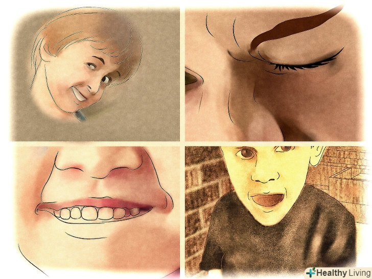 Зверніть увагу на інтенсивність прояву тика.синдром Туретта може проявляється в середньому ступені і сильно. Зазвичай симптоми цього захворювання - це посмикування і звуки, проте вони можуть включати і складні рухи. При складних тиках деякі рухи можуть супроводжуватися іншими - наприклад, людина одночасно качає головою і показує мову.[19] у дітей або дорослих з транзитивним тиком можуть бути складні рухи, але це буває набагато рідше.- Першими симптомами обох захворювань є лицьові тики: швидке моргання (одним оком або обома), підведення брів, посмикування носа, висунення губ вперед, гримасування, Показування мови.