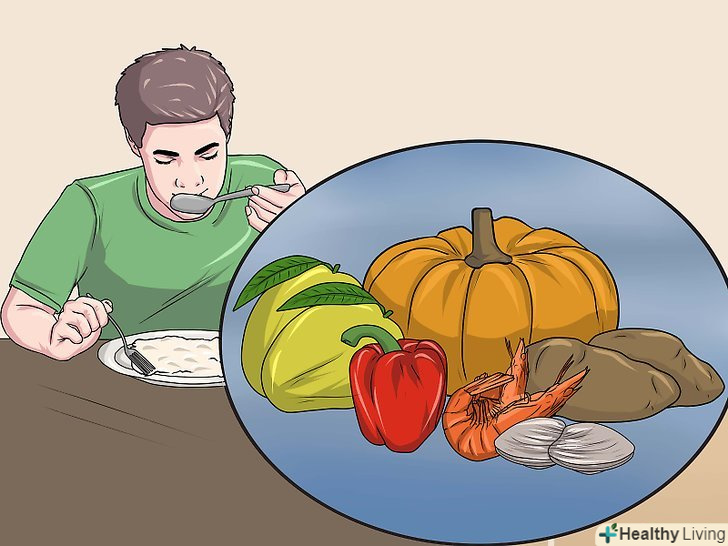 Збільште споживання мікроелементів, що підтримують щитовидну залозу. ви повинні збільшити кількість продуктів з поживними речовинами, які підвищують функцію вашої щитовидної залози. Постарайтеся щодня з'їдати принаймні одну порцію їжі, що містить ці мікроелементи.- Вживайте більше вітаміну А. до продуктів з високим вмістом вітаміну А відносяться овочі, такі як картопля, шпинат і інша темна листова зелень, також морква, гарбуз, брокколі, червоний перець, кабачки; фрукти, такі як диня, манго і абрикоси; бобові, м'ясо, печінка і риба.[7]