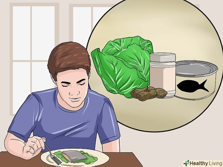 Обмежте споживання продуктів, що пригнічують щитовидну залозу.якщо у вас гіпотиреоз, це означає, що ваша щитовидна залоза функціонує повільніше, ніж зазвичай. Деякі продукти можуть впливати на функцію щитовидної залози, пригнічуючи її, що може тільки посилити проблему гіпотиреозу. Обмежте споживання деяких овочів, таких як капуста, брюссельська капуста, бруква, брокколі та бок-чой (Китайська листова капуста). Дані продукти можуть вплинути на засвоєння йоду щитовидною залозою. Якщо ви все ж хочете їх з'їсти, то приготуйте овочі на пару і не вживайте їх в сирому вигляді.[9]- Рекомендується обмежити вживання арахісу / арахісового масла, так як він може заважати засвоєнню йоду в нашому організмі.