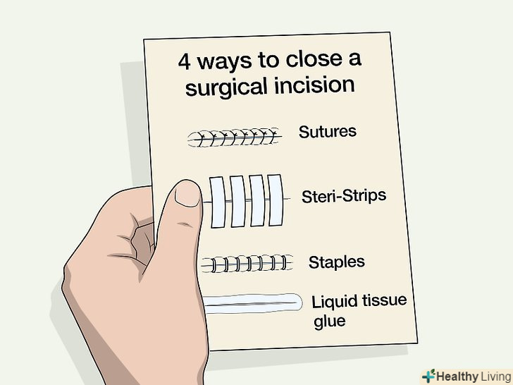 Дізнайтеся, як вам наклали шви.знання того, як вам наклали шви, дозволить запобігти появі травм і запалення.[1]- Найбільш поширені чотири способи хірургічного закриття ран: накладення шва з використанням ниток, застосування хірургічного степлера, застосування стерильного хірургічного пластиру і використання медичного клею.[2]