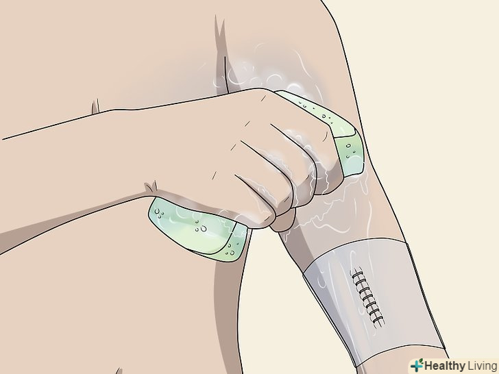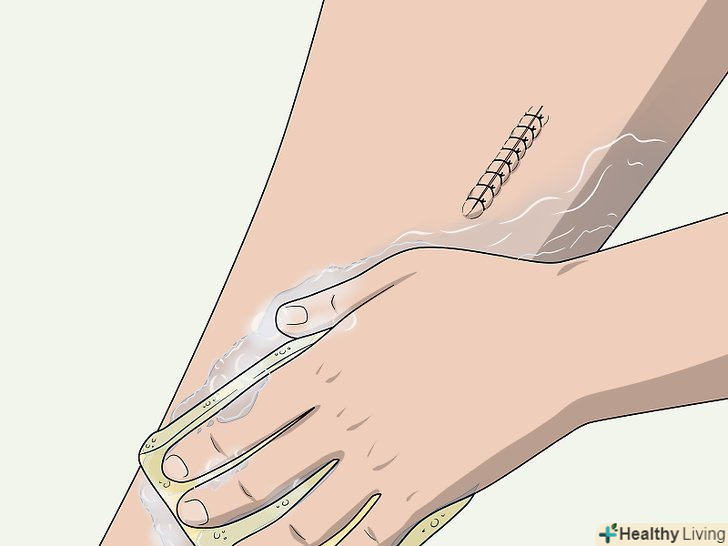 Обережно вимийте область навколо шва.якщо шов не потребує додаткового захисту від води, намагайтеся все ж не терти його мочалкою.[7]- Вимийте область навколо шва рідким милом і водою, але не дозволяйте засобам для купання потрапляти на сам шов. Потім акуратно обполосніть цю область чистою водою.[8]