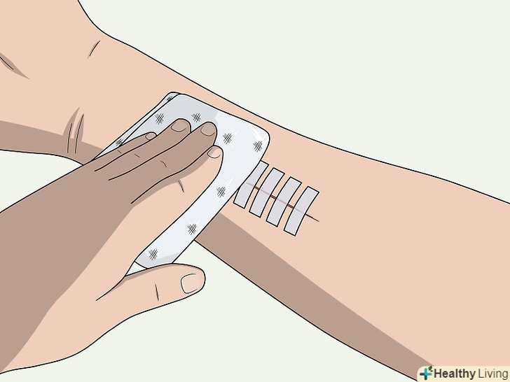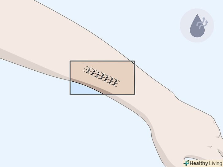 Не чіпайте хірургічний пластир, що закриває рану.після закінчення того періоду, коли рану потрібно підтримувати в сухому стані, хірургічний пластир вже можна мочити, проте, його не можна видаляти до тих пір, поки він сам не відвалиться.[13]- Після купання обережно промокніть область шва насухо, включаючи хірургічний пластир, якщо він все ще на місці.