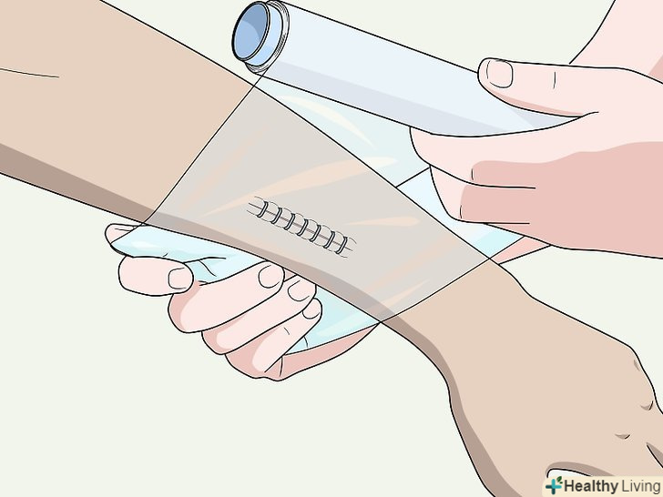 - Скористайтеся поліетиленом, сміттєвим пакетом або харчовою плівкою, щоб повністю закрити рану. По краях приклейте поліетилен пластиром, щоб не дати воді потрапити під захисну пов'язку.[16]