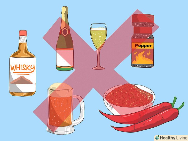 Відмовтеся від спиртних напоївІ гострої їжі.алкоголь і гостра їжа можуть провокувати гикавку, тому краще утримуватися від них. Це допоможе вам впоратися з хронічною гикавкою.[21]- Можна завести щоденник харчування, щоб зрозуміти, як часто у вас виникає гикавка після вживання спиртного або гострої їжі. Якщо виявиться, що алкоголь і гостра їжа не впливають на гикавку, можна не турбуватися про це.