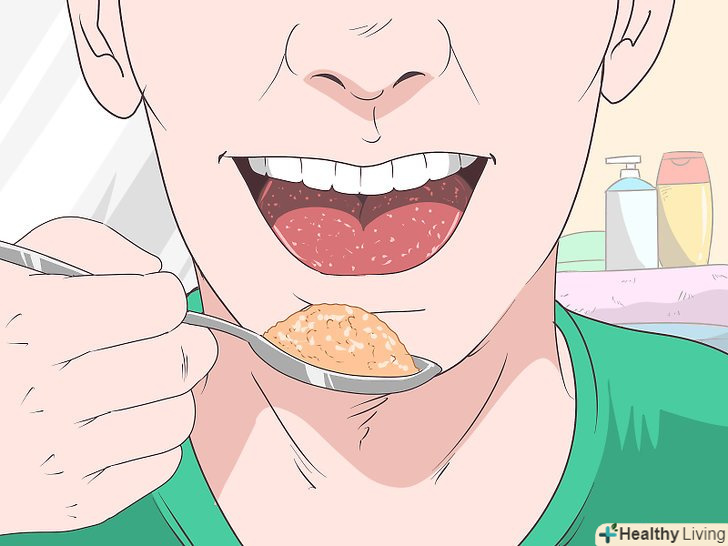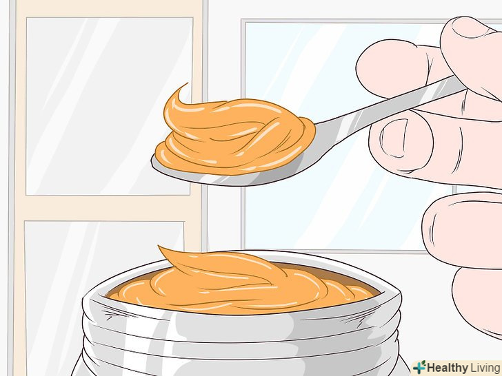 З'їжте ложку арахісової пасти.наберіть в чайну ложку арахісову пасту і покладіть її на язик. Потримайте пасту на мові протягом 5-10 секунд, щоб частина її розчинилася. Потім проковтніть її не пережовуючи.[6]- При бажанні замість арахісової можна використовувати іншу горіхову пасту, наприклад мигдальну пасту або Нутеллу.