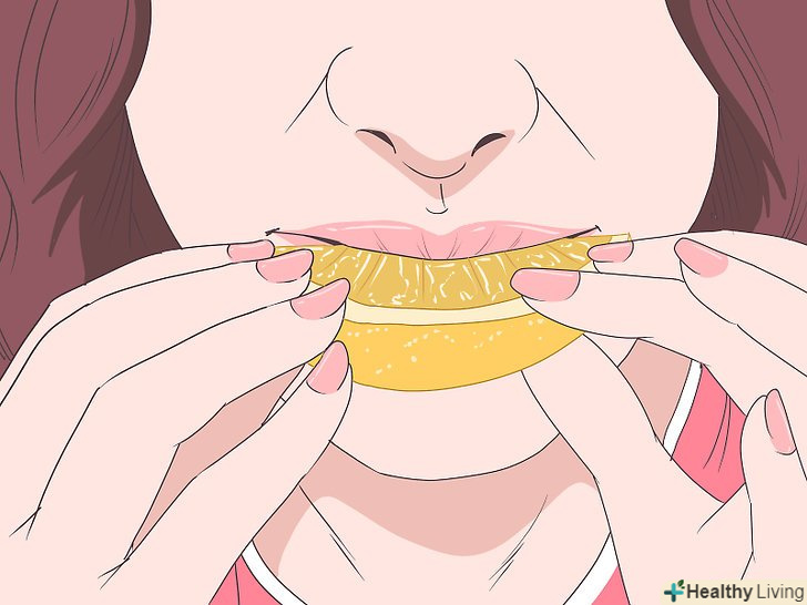 Пожуйте або посмокчіть скибочку лимона.покладіть в рот скибочку лимона і пожуйте або посмокчіть його і проковтніть виділився сік. Якщо лимон здається вам занадто кислим, можна додати трохи цукру.[4]- Смак лимонного соку викликає реакцію, подібну переляку.
