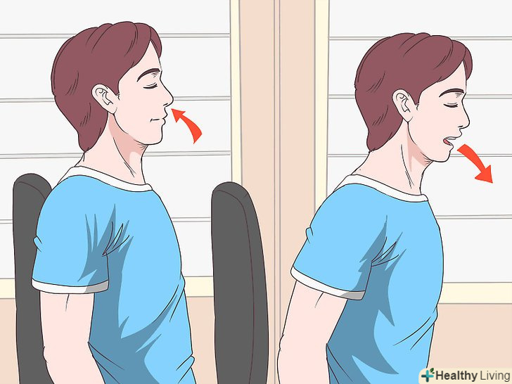 Використовуйте розмірене дихання: вдихайте і видихайте на рахунок п'ять. Повільно вдихніть повітря, так щоб ваші легені заповнилися, коли ви дорахуєте до п'яти. Затримайте дихання і знову порахуйте до п'яти, потім повільно видихніть на рахунок п'ять. Повторіть це до п'яти разів, щоб позбутися від гикавки.[10]- Якщо гикавка не пройшла після того, як ви зробили п'ять вдихів і видихів, відпочиньте приблизно 20 хвилин, потім повторіть вправу.