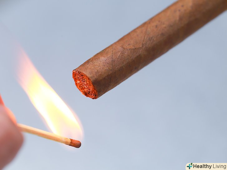 Тримайте сигару пальцями у вогні під кутом 45 градусів і злегка повертайте (або над вогнем, якщо не використовуєте дерев'яні сірники або бутанову запальничку), роблячи короткі вдихи, поки кінчик сигари не стане вишневого кольору.ви можете подути на кінчик сигари, щоб перевірити, чи рівномірно ви запалили її.