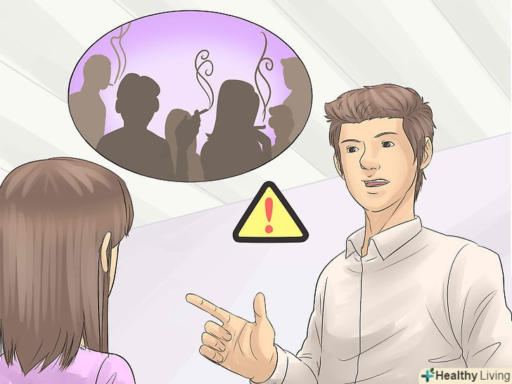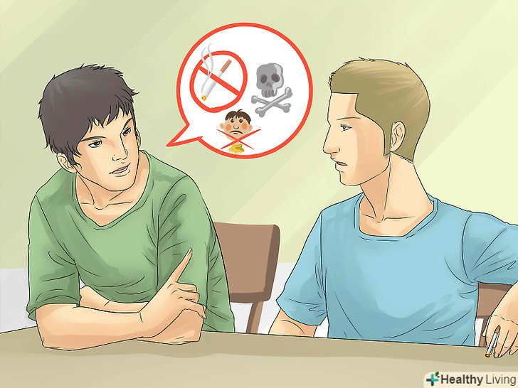 Не дозволяйте друзям і родичам курити в присутності ваших дітей.можливо, у вас є близькі люди, які не готові відмовлятися від куріння. Поясніть їм, що ви цінуєте їх присутність у своєму житті і в житті ваших дітей, але ви не можете допустити куріння в присутності малюків, тому дітям не можна буде перебувати поруч з людьми, що палять.- Допоможіть їм зрозуміти, що палить людина наражає на небезпеку всіх навколо, особливо дітей, оскільки їх організми ще розвиваються. Будьте наполегливі, але при цьому не грубіть.