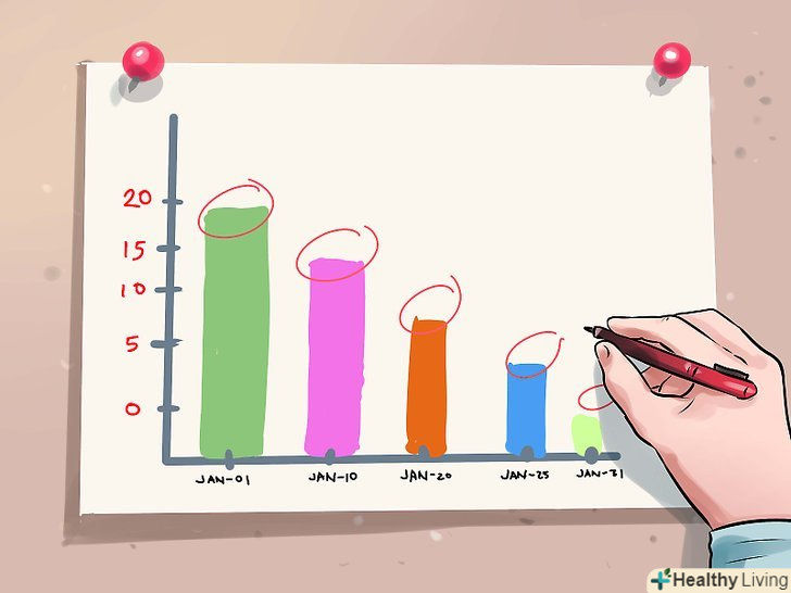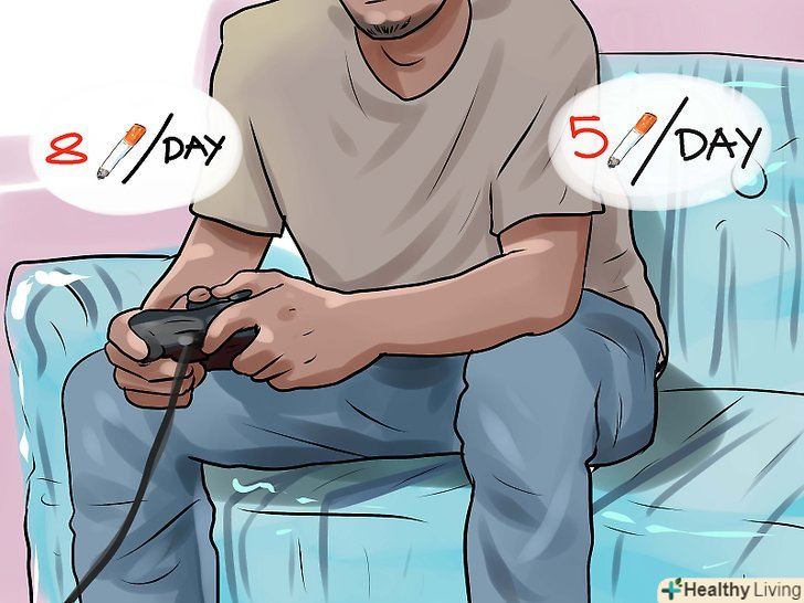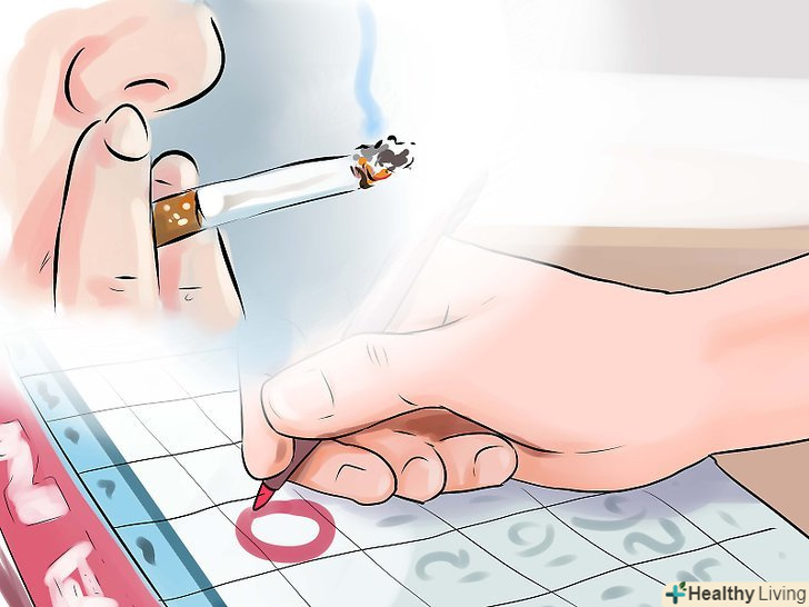 Визначте допустиму денну норму.після того як ви підрахуєте, скільки сигарет викурюєте за день, задайтеся метою знизити цю кількість до певного рівня. Оскільки різка відмова від куріння пов'язаний з великими труднощами, може викликати стрес і з великою ймовірністю закінчитися невдачею, для початку обмежте куріння. Наприклад, якщо ви викурюєте за день одну пачку, тобто 20 сигарет, постарайтеся знизити їх кількість до 15.[2]- Ніхто крім вас не може визначити, наскільки слід обмежити куріння. Проте, для початку можна скоротити кількість сигарет на чверть. Наприклад, якщо ви викурюєте за день 16 сигарет, знизьте їх кількість до 12. Якщо ж ви викурюєте 12 сигарет, перейдіть на 8 сигарет в день.