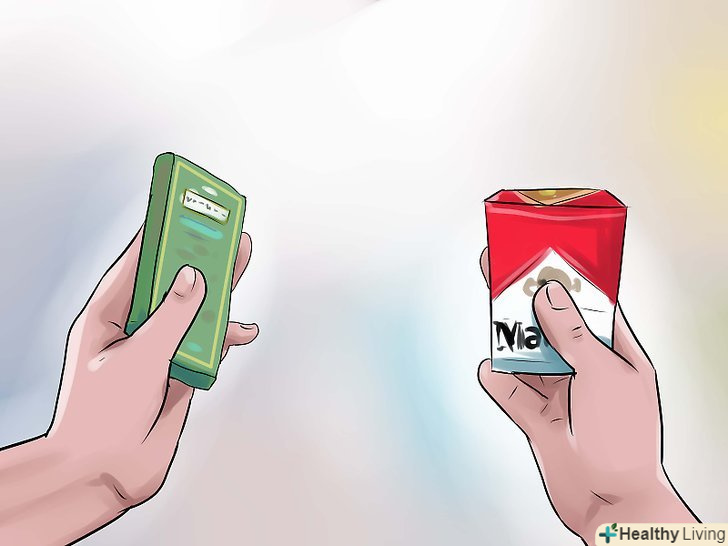 Подумайте про повну відмову від куріння.після того як ви успішно обмежите куріння і знизите кількість сигарет, можливо, ви знайдете в собі сили повністю відмовитися від цієї згубної звички. Можна приєднатися до групи підтримки, що дозволить вам обговорювати свої проблеми і методи їх подолання зі своїми однодумцями. Можна також спробувати наступні способи:- Нікотинова терапія (НЗТ). Даний метод полягає у використанні нікотинових інгаляторів, пластирів, жувальних гумок і лікарських засобів для перорального прийому. Ці кошти знижують нікотинову залежність і полегшують відмову від куріння.[22] Не приступайте до НЗТ в тому випадку, якщо ви все ще курите, так як це може підвищити рівень нікотину до небезпечних значень. Якщо ви намагаєтеся обмежити куріння, а не повністю відмовитися від нього, НЗТ може бути не найкращим вибором.[23]