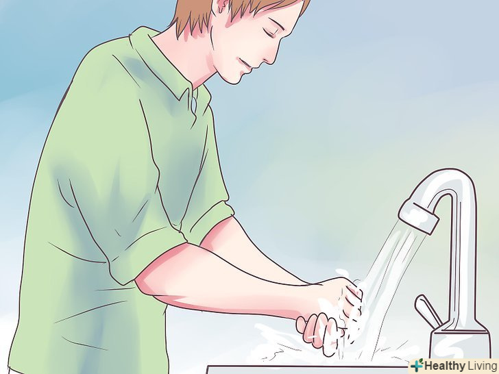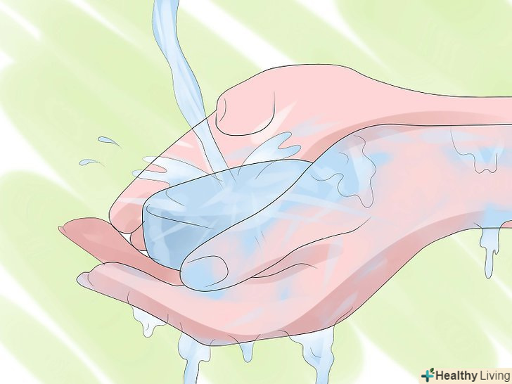 Користуйтеся милом.мийте руки теплою водою з шматком милом, який поміщається в долоні руки. Тріть руки не менше 15 секунд, щоб утворилася піна. Ретельно намильте руки з кожного боку, а також області між пальцями. Сполосніть руки водою. Висушіть руки паперовим рушником, а потім використовуйте його, щоб закрити кран. Викиньте рушник у смітник.[14]