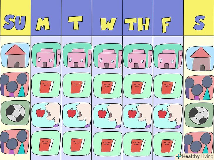 Складіть для дитини розклад з візуальними підказками.зображення і кольори також можуть бути використані для створення наочних або візуальних календарів, щоб допомогти дитині розуміти, в які дні він ходить в школу, а в які – ні, і відзначити всі майбутні події або особливі заходи.- Календар повинен бути розроблений таким чином, щоб використовувалося в основному символічне представлення. У дні, коли дитина ходить в школу, в календар можна помістити невеликі зображення/фотографії/ картинки школи, в дні, коли школи Немає, може бути застосовано зображення будинку, якщо дитина відвідує якісь заняття, наприклад футбольну секцію, то можна намалювати зображення невеликого футбольного м'яча.