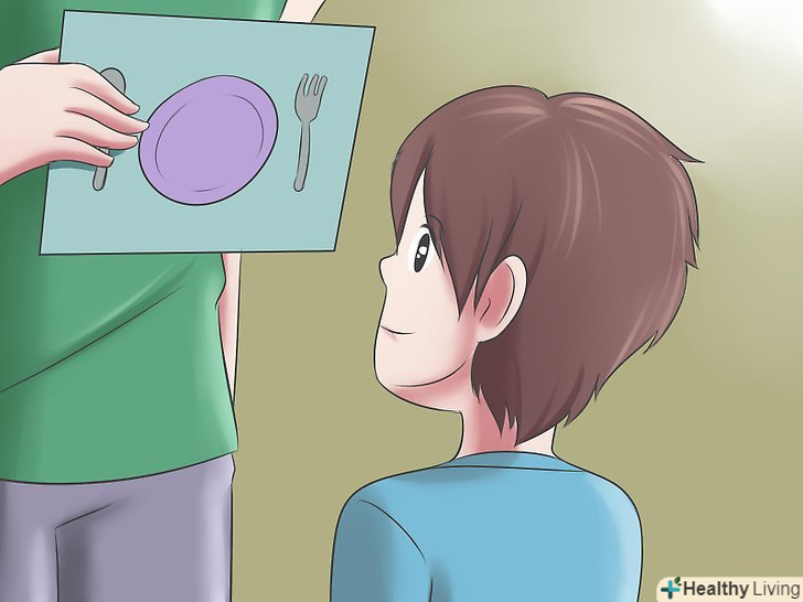 Використовуйте візуальні підказки для допомоги дитині взаємодіяти з членами сім'ї в домашній обстановці.через наочні посібники дитину з аутизмом можна навчити співпрацювати з членами сім'ї, щоб займатися будь-якою нормальною діяльністю наскільки це можливо. Вдома, наприклад, дитина може використовувати наочні посібники, такі як картинки, Малюнки для співпраці з іншими членами сім'ї і таким чином, щоденне спілкування стає менш складним. Дитину можна навчити простим, але важливим завданням. Наприклад, він може навчитися, як накривати на стіл:- Місця, куди треба покласти ложки, виделки, ножі, тарілки, гуртки і чашки можуть бути вказані шляхом вставки/вклейки зображення конкретного предмета на поверхню полиці/ящика/шафи.