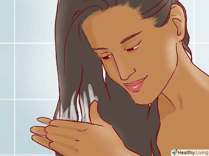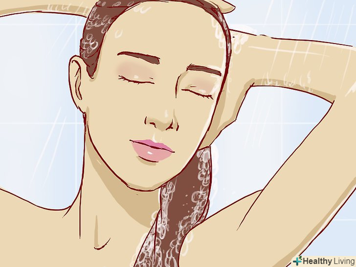 - Щоб змити шампунь, лийте воду на голову, щоб вона стікала по кінчиках волосся. Не тріть волосся під час змивання — це може привести до випадання волосся.[6]