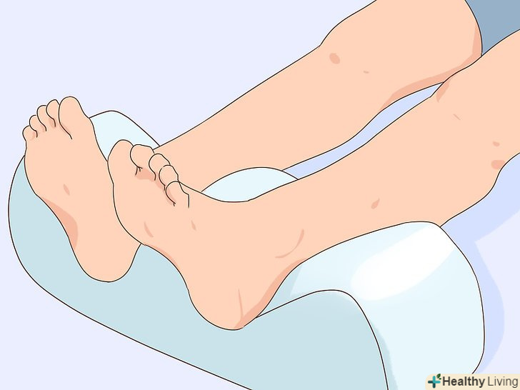 Підніміть і Стисніть набряклі кінцівки.якщо ви вважаєте, що затримуєте рідини в ступнях, щиколотках і гомілках, підніміть набряклі частини тіла. Таким чином, гравітація витягне трохи рідин з ступень і розподілить її по організму.[7]- Наприклад, якщо ввечері у вас розпухнуть ступні, приляжте на диван або ліжко і підкладіть під ноги подушку.