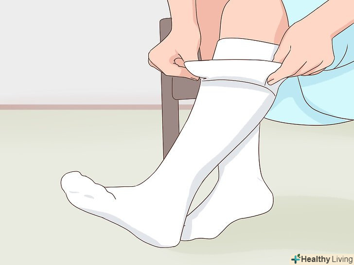 Носіть компресійні панчохи.якщо ви помітили, що в положенні сидячи або стоячи в ступнях і щиколотках часто накопичується рідина (наприклад, на роботі), тоді вам варто купити компресійні панчохи. Вони чинять тиск на ступні і гомілку і не дозволяють рідинам накопичуватися в них.[8]- Підтримуючі шкарпетки або панчохи зустрічаються досить часто. Їх можна купити в найближчій аптеці.